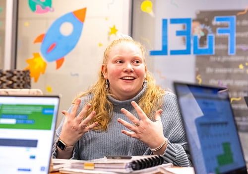 A double major in entrepreneurship and hospitality management, Drager regularly whisks together orders for gourmet cupcakes while sister Becca Drager ’23 helps run pop-ups around campus.